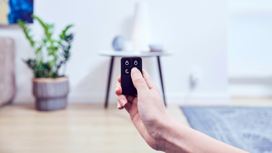 Oveni det kan du med fjernbetjeningen tænde eller slukke lamper og andre elektriske apparater pga. dens indbyggede SmartHome tænd/sluk knap.