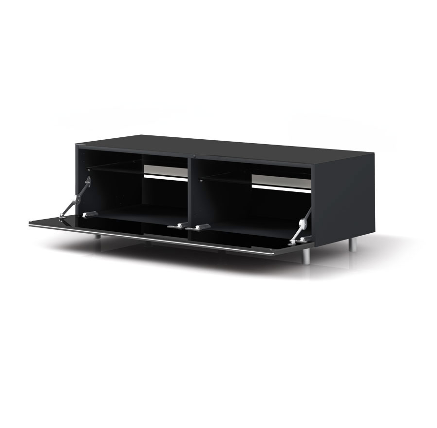 TV møbel i tidløst design med højglans ridstefrit glas. Med 1 skuffe og 2 justerbare hylder i klar glas.