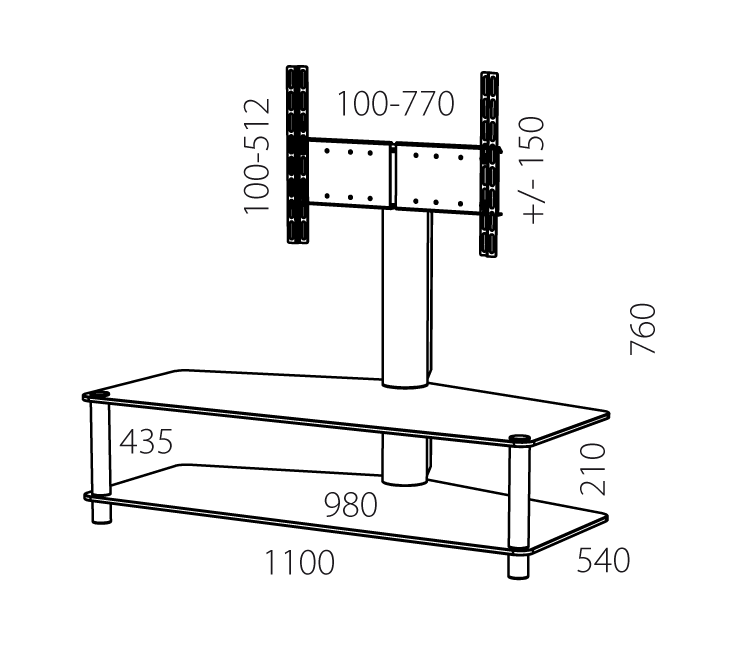 Åbent glasmøbel med drejbart TV-beslag (90 grader).