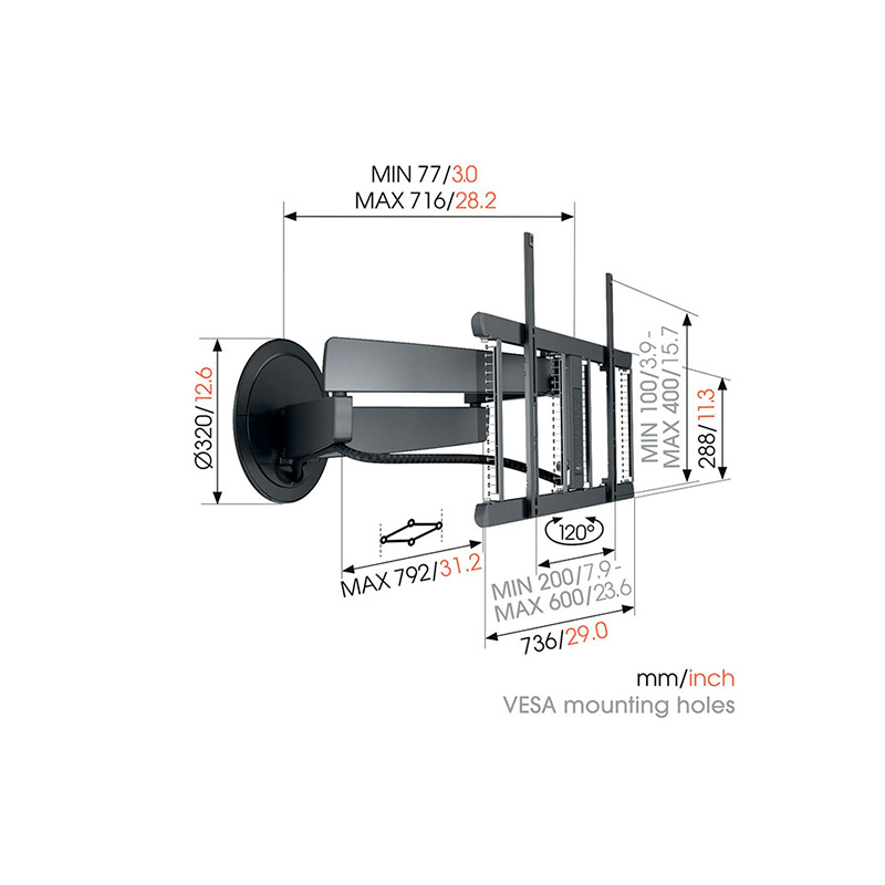 - Fuldend dit monteringssystem med en matchende aluminiumskabelsøjle Motoriseret vægbeslag i fuld bevægelse med genialt, avanceret design.